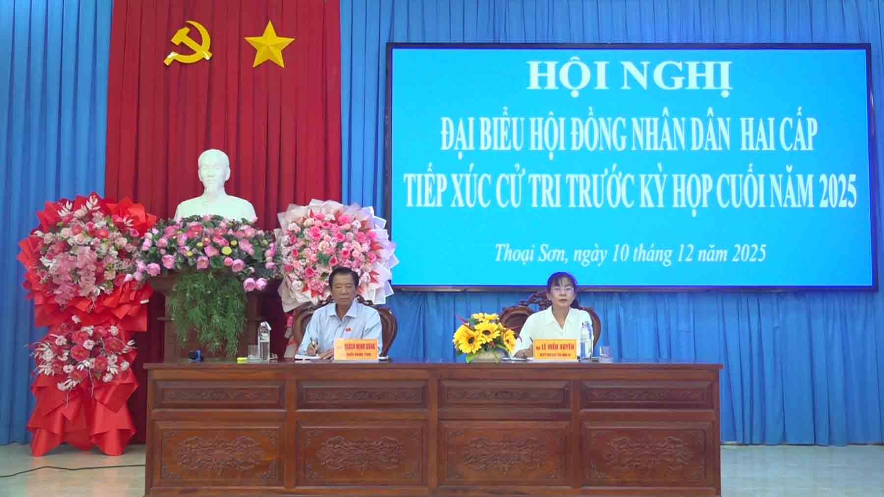 Tại buổi tiếp xúc, đại diện Tổ đại biểu HĐND tỉnh đã thông báo đến cử tri dự kiến nội dung, chương trình và thời gian tổ chức kỳ họp cuối năm 2025; đồng thời báo cáo kết quả giải quyết các kiến nghị của cử tri từ những lần tiếp xúc trước. UBND xã Thoại Sơn cũng trình bày báo cáo tóm tắt tình hình phát triển kinh tế - xã hội năm 2025 và kết quả trả lời những phản ánh của người dân thời gian qua.