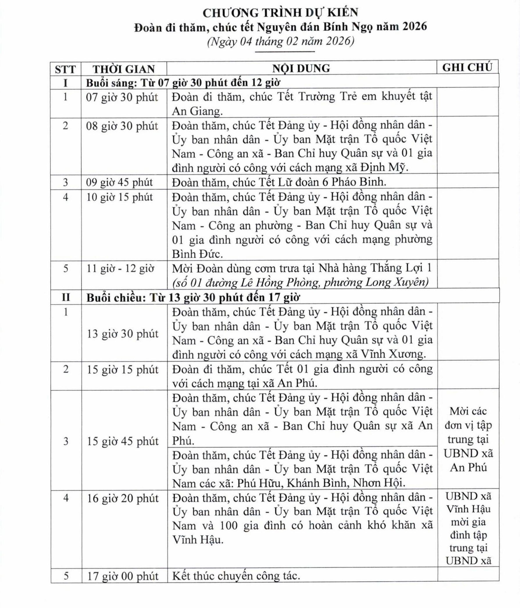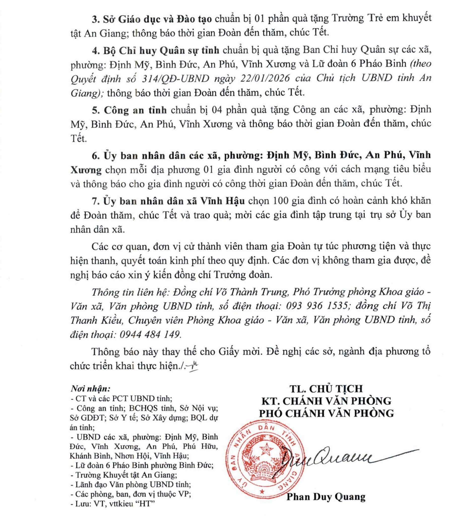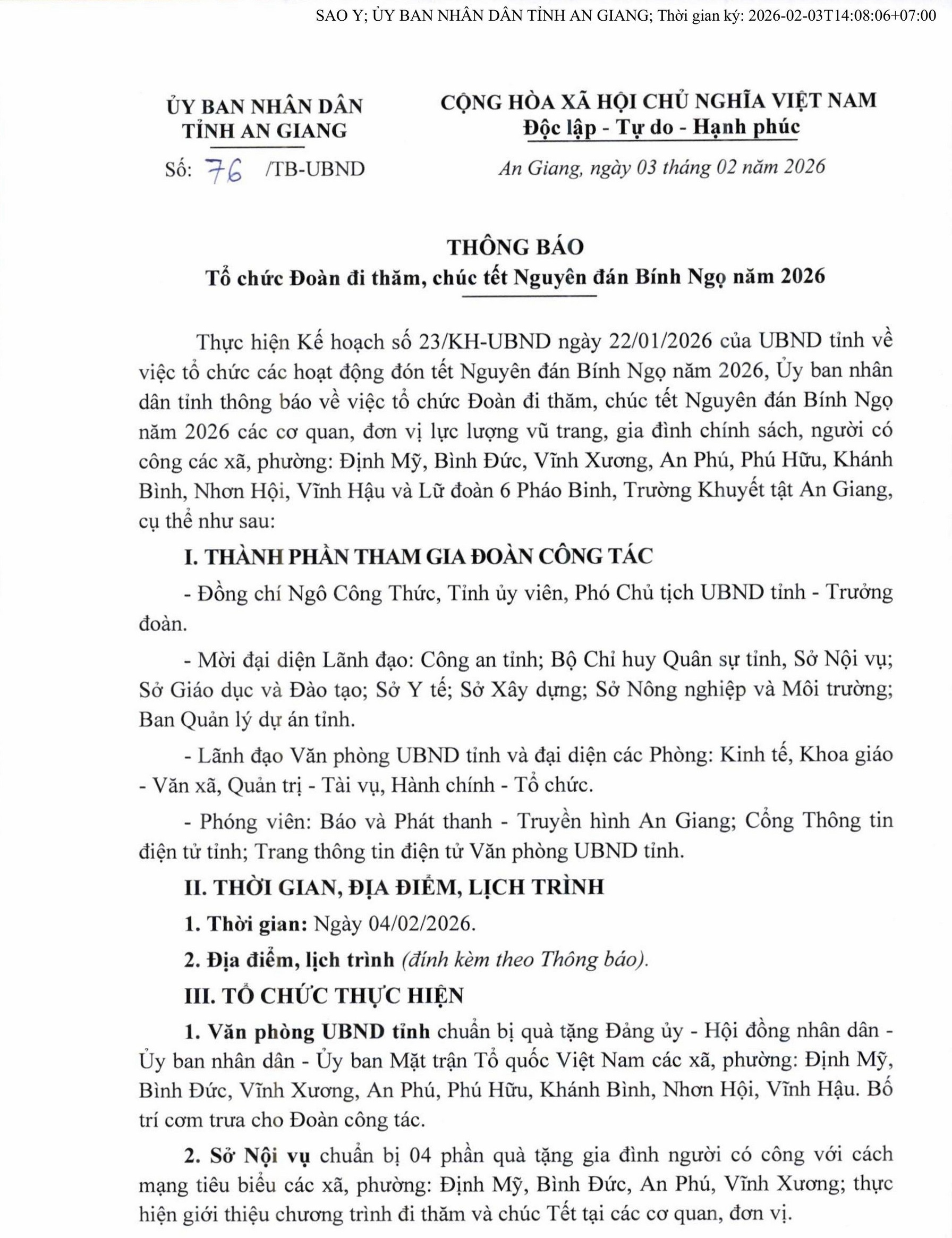 Thông báo số: 76/TB-UB của Ủy ban nhân dân tỉnh An Giang ban hành ngày 03 tháng 02 năm 2026, về việc Tổ chức Đoàn đi thăm, chúc tết Nguyên đán Bính Ngọ năm 2026.