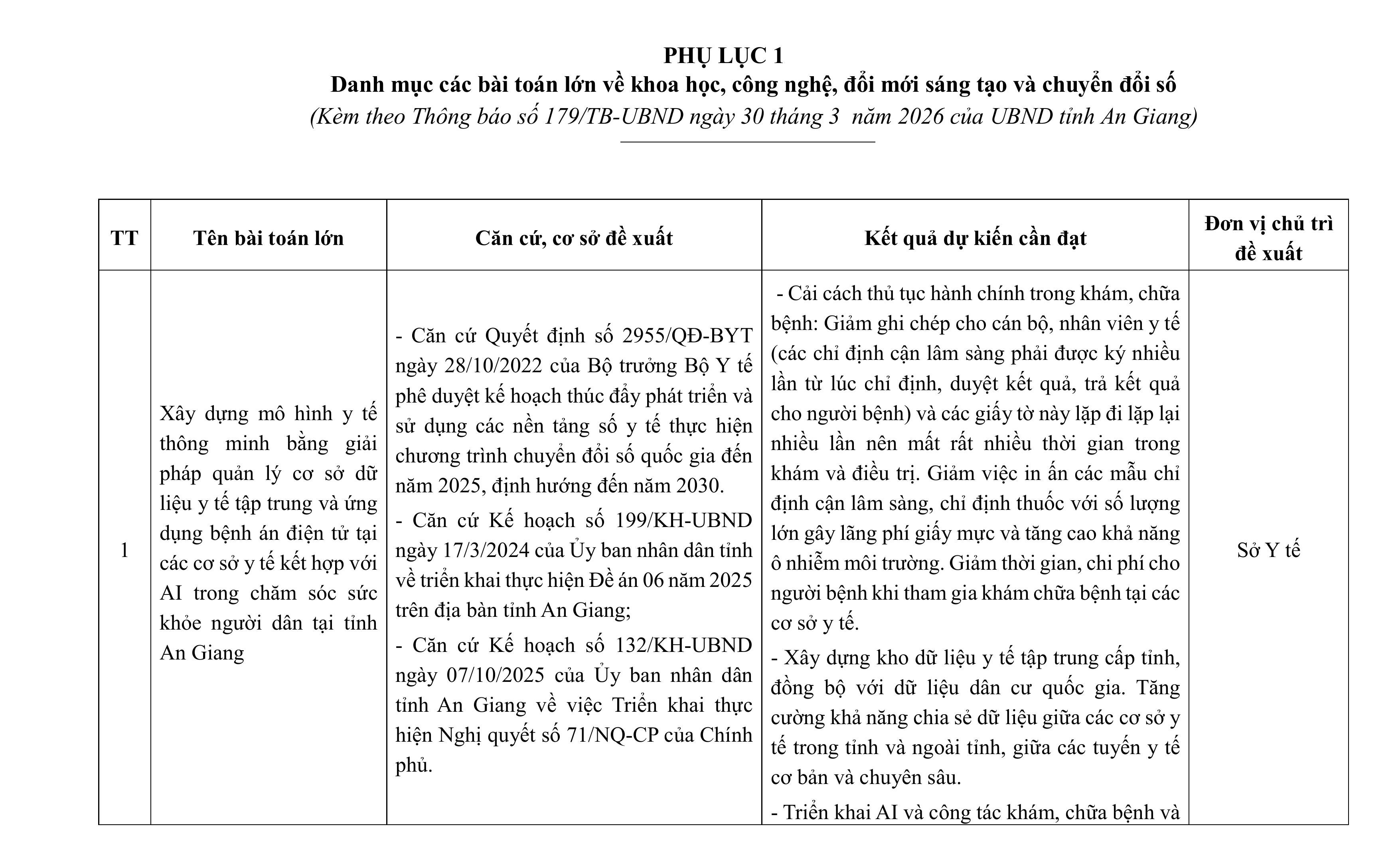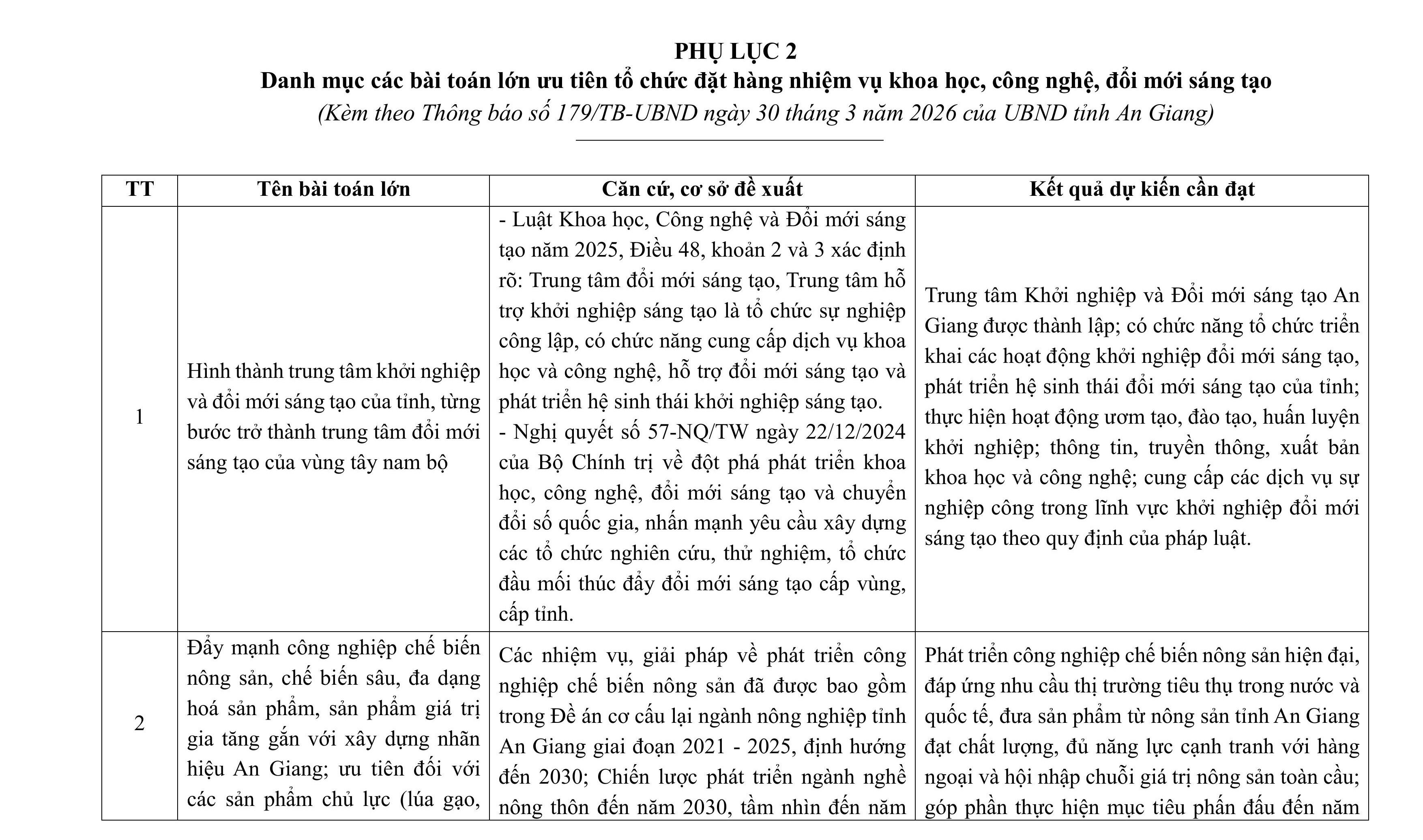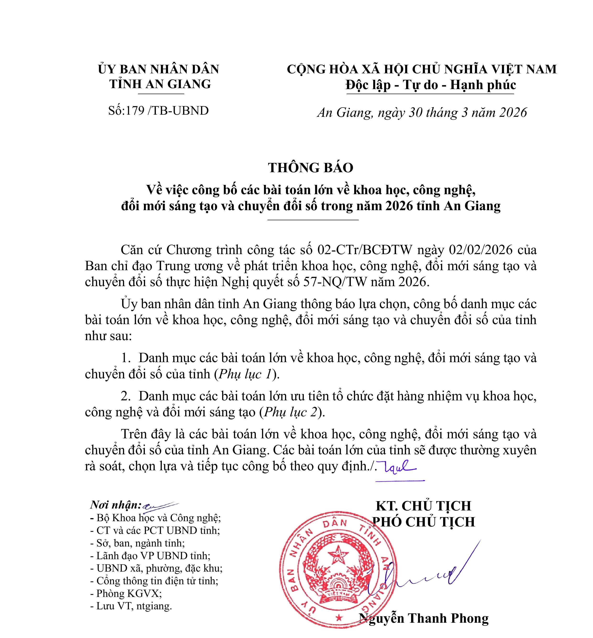 aA Thông Báo Nghị quyết 57 Khoa học - Công nghệ Thông báo Về việc công bố các bài toán lớn về khoa học, công nghệ, đổi mới sáng tạo và chuyển đổi số trong năm 2026 tỉnh An Giang 03/04/2026, 15:53 Quay về Chia sẻ Copy link thành công Bài viết cùng chuyên mục Công bố kết quả xếp loại các cơ quan, đơn vị theo Bộ chỉ số phục vụ người dân, doanh nghiệp tháng 03 năm 2026 Thông Báo Công Dân Thông Báo Kết quả TTHC Doanh Nghiệp 03/04/2026 Dự báo thời tiết điểm 10 ngày tới tại An Giang Thời tiết - Thủy văn mực nước Thông Báo 03/04/2026 Thông báo về Phương thức nhận Thông báo nghĩa vụ tài chính về đất đai của người nộp thuế Quy ĐỊnh - Hướng Dẫn - Chính Sách Thông Báo Công Dân Thông Báo 02/04/2026 Quyết định điều chỉnh, bổ sung Bảng giá tính lệ phí trước bạ đối với ô tô, xe máy trên địa bàn tỉnh An Giang Thông tin thuế, phí, lệ phí của tỉnh/ngành/địa phương Thông Báo Tài chính - Ngân sách 01/04/2026 Tin dự báo nắng nóng tỉnh An Giang Thời tiết - Thủy văn mực nước Thông Báo 01/04/2026 Quyết định đặt tên, số hiệu các tuyến đường tỉnh trên địa bàn tỉnh An Giang Thông tin chỉ đạo điều hành Thông Báo Công Dân Thông Báo 27/03/2026 Chỉ thị tăng cường công tác bảo vệ môi trường trên địa bàn tỉnh An Giang Thông tin chỉ đạo điều hành Thông Báo 24/03/2026 Quyết định phân cấp thẩm quyền quyết định cho phép miễn, giảm tiền sử dụng đất đối với người có công với cách mạng và thân nhân liệt sĩ trên địa bàn tỉnh An Giang Thông tin thuế, phí, lệ phí của tỉnh/ngành/địa phương Thông Báo Công Dân Thông Báo 22/03/2026 Nghị quyết công bố kết quả bầu cử và danh sách những người trúng cử đại biểu Hội đồng nhân dân tỉnh An Giang khóa XI, nhiệm kỳ 2026 - 2031 Thông Báo Nghị quyết HĐND Bầu cử Đại biểu HĐND các cấp, nhiệm kỳ 2026-2031 19/03/2026 Quyết định ban hành đơn giá trồng rừng thay thế trên địa bàn tỉnh An Giang Thông tin thuế, phí, lệ phí của tỉnh/ngành/địa phương Thông Báo Công Dân Thông Báo 17/03/2026 /vi/thong-bao-ve-viec-cong-bo-cac-bai-toan-lon-ve-khoa-hoc-cong-nghe-doi-moi-sang-tao-va-chuyen-doi-so-trong-nam-2026-tinh-an-giang