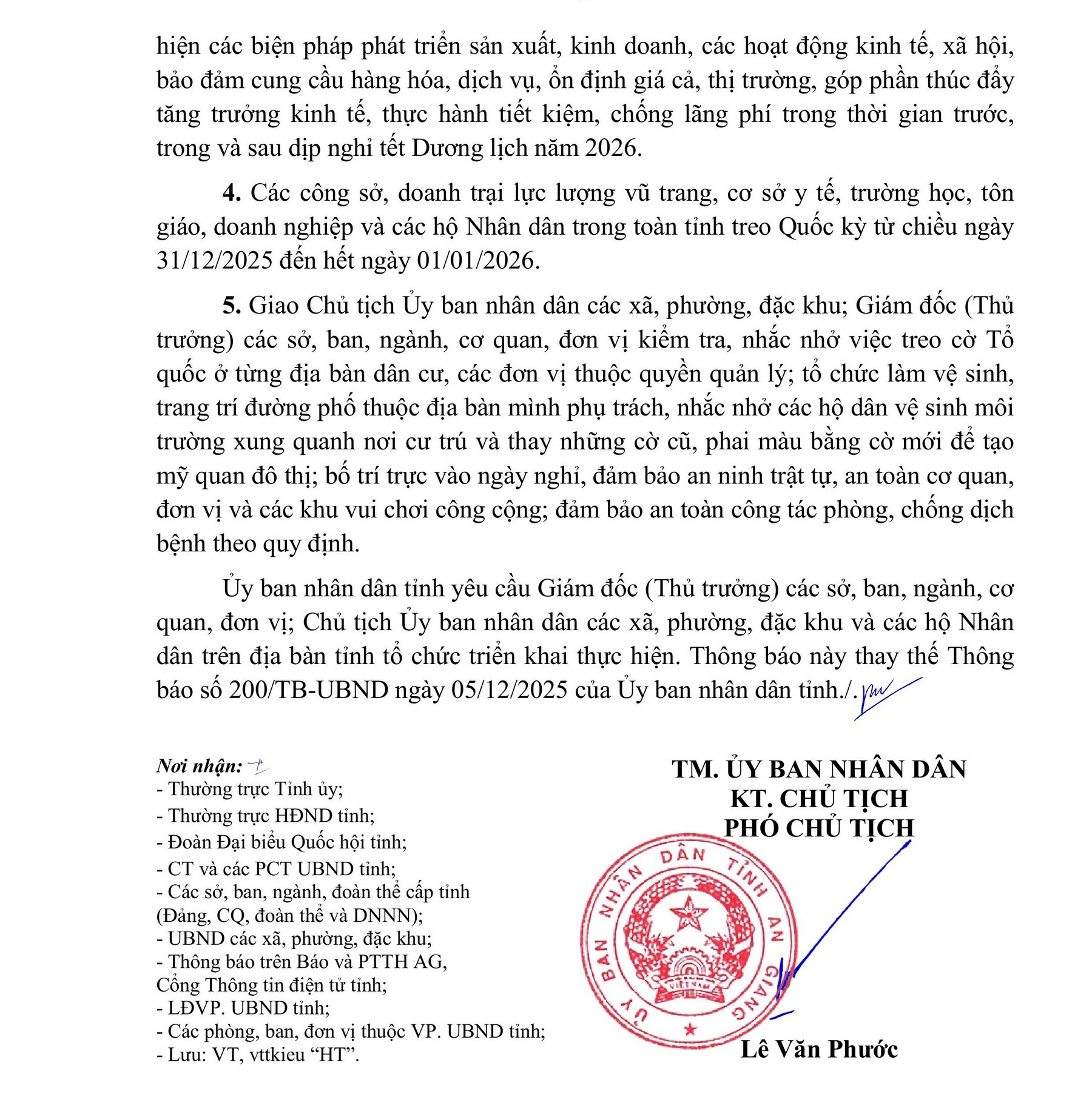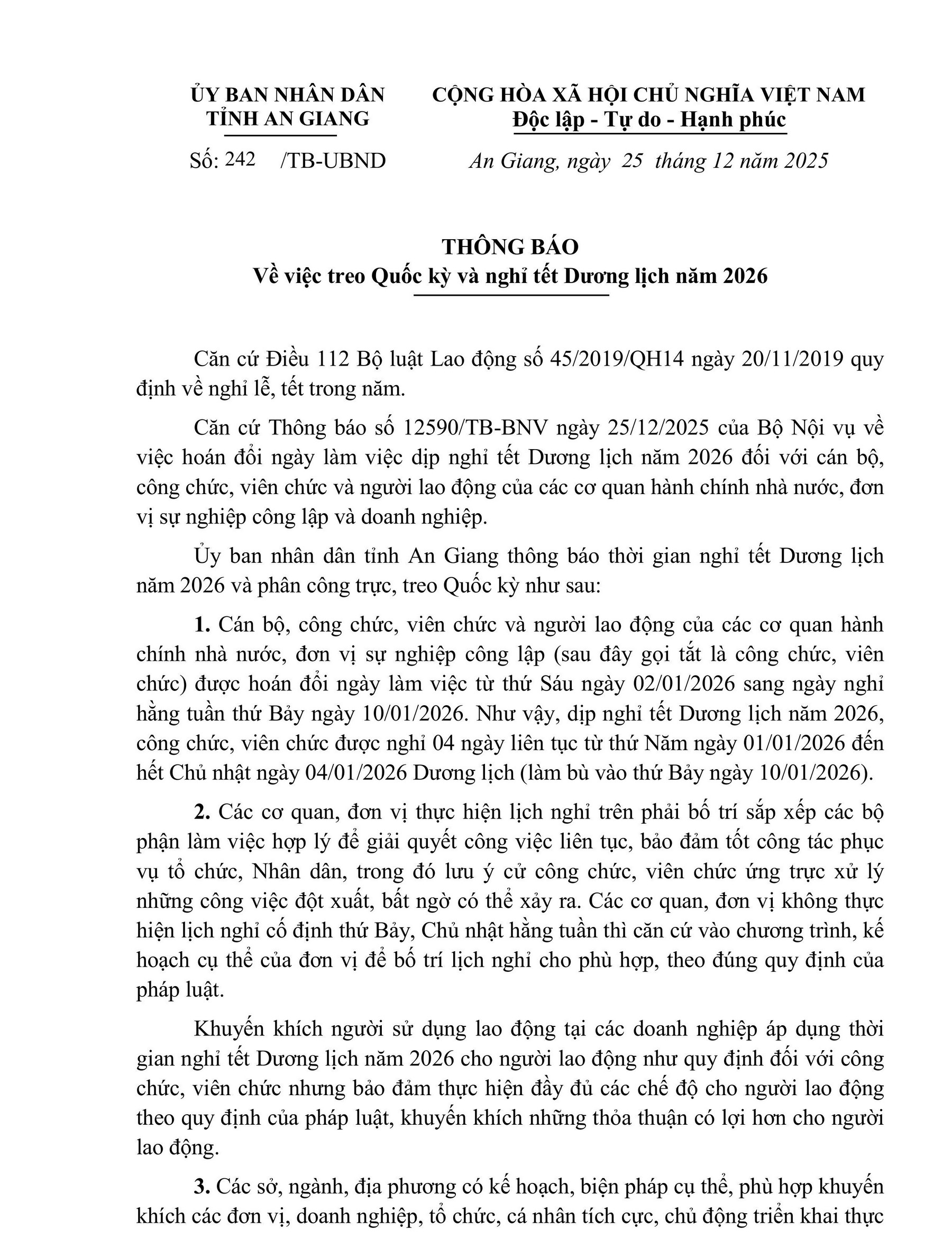 aA Thông tin chỉ đạo điều hành Thông Báo Công Dân Thông Báo Thông báo Về việc treo Quốc kỳ và nghỉ tết Dương lịch năm 2026 26/12/2025, 13:57 Xem chi tiết Thông báo số:242/TB-UBND Về việc treo Quốc kỳ và nghỉ tết Dương lịch năm 2026 (901.19 KB) Quay về Chia sẻ Copy link thành công Bài viết cùng chuyên mục Triển khai hướng dẫn thành lập Ban Chỉ đạo và Tổ thường trực Giúp việc Ban Chỉ đạo tổng điều tra kinh tế năm 2026 Thông tin chỉ đạo điều hành Quy ĐỊnh - Hướng Dẫn - Chính Sách 26/12/2025 Triển khai Nghị quyết số 11/2025/NQ-HĐND ngày 14/11/2025 của Hội đồng nhân dân tỉnh Thông tin chỉ đạo điều hành 25/12/2025 Đẩy mạnh triển khai thực hiện sắp xếp, bố trí, xử lý các cơ sở nhà, đất sau khi sắp xếp tổ chức bộ máy, đơn vị hành chính các cấp theo chỉ đạo của Bộ Chính trị, Ban Bí thư, Thủ tướng Chính phủ Thông tin chỉ đạo điều hành 24/12/2025 Chống buôn lậu, gian lận thương mại và hàng giả dịp trước, trong và sau tết Nguyên đán Bính Ngọ 2026 Thông tin chỉ đạo điều hành 23/12/2025 Chấn chỉnh việc nộp hồ sơ mua, bán nhà ở xã hội Thông tin chỉ đạo điều hành 22/12/2025 Khẩn trương triển khai thực hiện ý kiến chỉ đạo của Phó Thủ tướng Chính phủ Hồ Quốc Dũng tại Văn bản số 12188/VPCPKSTT ngày 10/12/2025 về kết quả rà soát TTHC do địa phương ban hành Thông tin chỉ đạo điều hành 22/12/2025 Chấn chỉnh việc nộp hồ sơ mua, bán nhà ở xã hội Thông tin chỉ đạo điều hành 19/12/2025 Kế hoạch tổ chức Cuộc thi sáng tác biểu tượng (logo) tỉnh An Giang Thông tin chỉ đạo điều hành Văn hóa - Thể thao 19/12/2025 Kế hoạch Xúc tiến Đầu tư, Thương mại và Du lịch tỉnh An Giang giai đoạn 2026 - 2030 Chiến lược, Kế hoạch, Quy hoạch Thông tin chỉ đạo điều hành Thông tin Kinh tế - Xã hội Thông tin đầu tư 19/12/2025 Triển khai Công văn số 7805/BTP-VP ngày 28/11/2025 của Bộ Tư pháp Thông tin chỉ đạo điều hành 19/12/2025 /vi/thong-bao-ve-viec-treo-quoc-ky-va-nghi-tet-duong-lich-nam-2026