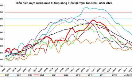 Biểu đồ mực nước cao nhất ngày và TBNN các trạm thủy văn tỉnh An Giang mùa lũ (từ ngày 15/6 đến ngày 30/11/2025)