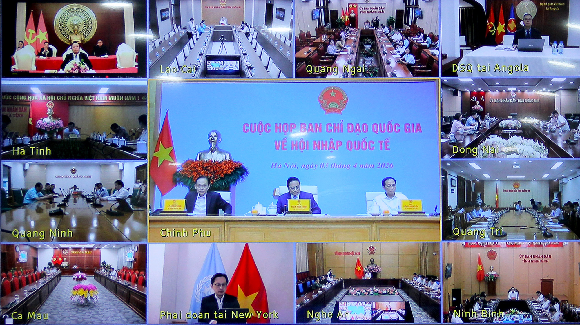 (Cổng TTĐT tỉnh AG)-Chiều 03/4, Thủ tướng Chính phủ Phạm Minh Chính chủ trì cuộc họp Ban Chỉ đạo quốc gia về hội nhập quốc tế, quý I năm 2026. Cùng tham dự có Phó Thủ tướng Bùi Thanh Sơn, Bộ trưởng Bộ Ngoại giao Lê Hoài Trung; lãnh đạo các bộ, ngành, địa phương và các thành viên Ban Chỉ đạo quốc gia về hội nhập quốc tế… Cuộc họp được tổ chức trực tiếp tại điểm cầu Trung ương và kết nối trực tuyến đến các tỉnh, thành phố trên toàn quốc.