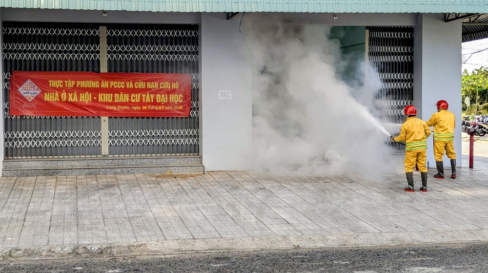 (Cổng TTĐT tỉnh AG)- Chiều 24/01, tại phường Long Xuyên, tỉnh An Giang, Tổ chữa cháy và cứu nạn cứu hộ Mỹ Thới (thuộc Đội chữa cháy và cứu nạn cứu hộ khu vực Châu Thành) phối hợp Ban quản lý Nhà ở Xã Hội – Khu Dân Cư Tây Đại Học ( thuộc Công ty Cổ phần Xây Lắp An Giang) tổ chức thực tập phương án chữa cháy và cứu nạn cứu hộ tại chung cư.