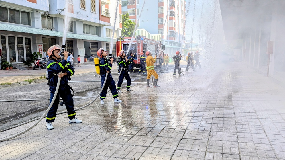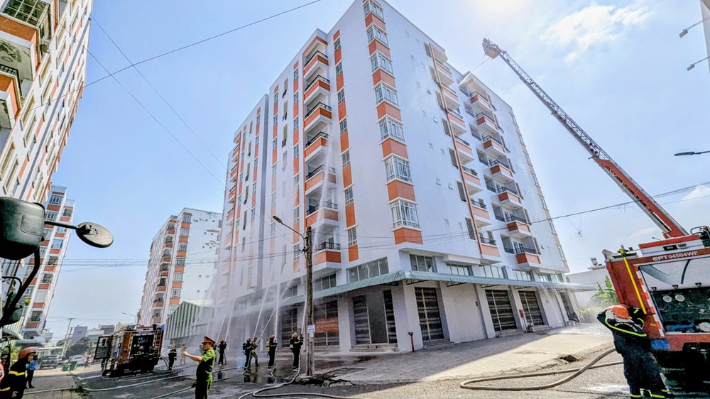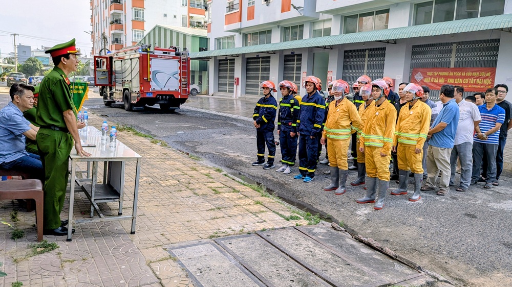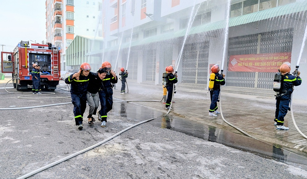 Nhận được tin báo cháy, Tổ chữa cháy và cứu nạn cứu hộ Mỹ Thới lập tức điều động 3 xe chữa cháy; 01 xe cứu nạn cứu hộ; 01 xe chỉ huy; 01 xe thang chữa cháy, 01 máy bơm, cùng hơn 35 cán bộ chiến sĩ nhanh chóng đến ngay hiện trường triển khai đội hình, phối hợp cùng lực lượng chữa cháy của chung cư tiến hành chữa cháy. Một nhóm dùng các vòi phun nước khống chế đám cháy và làm mát các tầng của tòa nhà chung cư chóng cháy lan, nhóm còn lại cứu người bị nạn còn kẹt bên trong thoát ra ngoài an toàn. Sau khoảng 15 phút phối hợp tích cực chữa cháy giữa các lực lượng, đám cháy giả định đã được dập tắt hoàn toàn, toàn bộ nạn nhân đã được cứu hộ thành công.