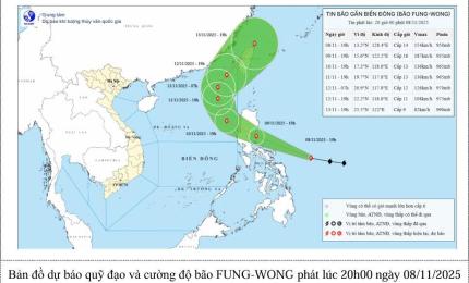 aA Thời tiết Nông Nghiệp Nông Thôn Tin Bão gần biển Đông (cơn bão Fung Wong) 09/11/2025, 11:55 Xem chi tiết Bản tin Đài Khí tượng thủy văn tỉnh An Giang số: XTNĐ-04/08h00/AGIA (571.67 KB) Quay về Chia sẻ Copy link thành công Bài viết cùng chuyên mục Tin bão gần biển đông (Cơn bão FUNG-WONG) Thời tiết Thông Báo 08/11/2025 Tin cuối cùng về cơn bão số 13 Thời tiết Nông Nghiệp Nông Thôn 07/11/2025 Bão khẩn cấp (Cơn bão số 13) Thời tiết Nông Nghiệp Nông Thôn 06/11/2025 Cảnh báo dông, lốc, sét, mưa đá và mưa lớn cục bộ tỉnh An Giang Thời tiết Thông Báo 05/11/2025 Cảnh báo ngập lụt trên khu vực các phường Long Xuyên, Bình Đức, Mỹ Thới và xã Mỹ Hòa Hưng - tỉnh An Giang Thời tiết Thủy văn - Mực nước Nông Nghiệp Nông Thôn 05/11/2025 Bão khẩn cấp (Cơn bão số 13) Thời tiết 05/11/2025 Tin bão gần biển đông (Cơn bão KALMAEGI) Thời tiết 04/11/2025 Tin bão gần biển Đông (Cơn bão KALMAEGI) Thời tiết 03/11/2025 Biểu đồ mực nước cao nhất ngày và TBNN các trạm thủy văn tỉnh An Giang mùa lũ (từ ngày 15/6 đến ngày 30/11/2025) Thời tiết Thủy văn - Mực nước 01/11/2025 Dự báo thời tiết điểm 10 ngày tới tại An Giang Thời tiết 01/11/2025 /vi/tin-bao-gan-bien-dong-con-bao-fung-wong-0