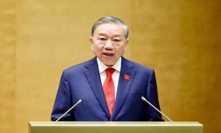 "Dưới cờ đỏ sao vàng thiêng liêng của Tổ quốc, trước Quốc hội, đồng bào và cử tri cả nước, tôi - Chủ tịch nước Cộng hòa xã hội chủ nghĩa Việt Nam, xin tuyên thệ: Tuyệt đối trung thành với Tổ quốc, với nhân dân, với Hiến pháp nước Cộng hòa xã hội chủ nghĩa Việt Nam, nỗ lực phấn đấu hoàn thành tốt mọi nhiệm vụ mà Đảng, Nhà nước và nhân dân giao phó", Tổng Bí thư, Chủ tịch nước Tô Lâm tuyên thệ.