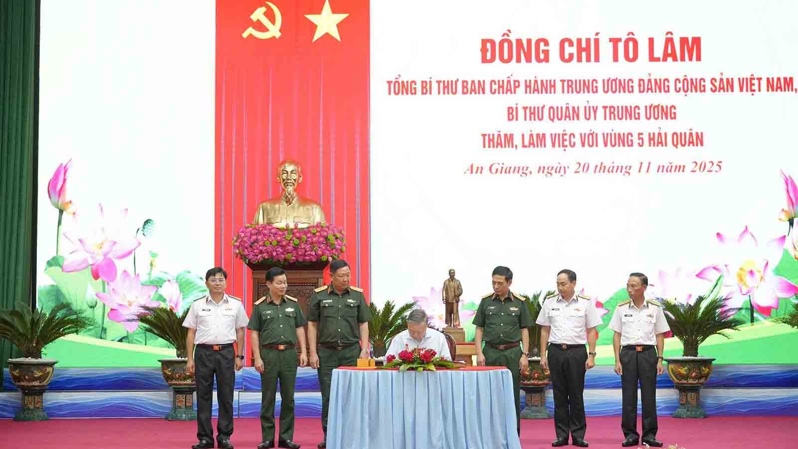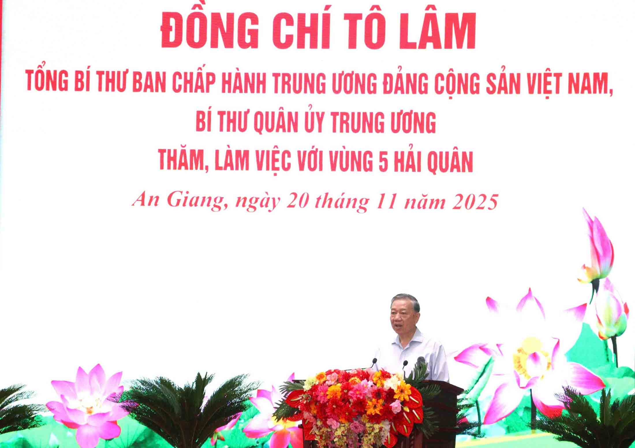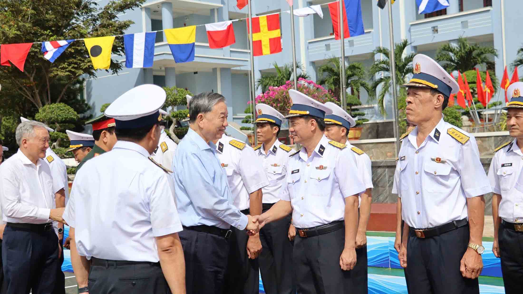 Trong chuyến thăm và làm việc tại Vùng 5 Hải quân, Tổng Bí thư Tô Lâm gửi lời thăm hỏi, chúc mừng tới cán bộ, chiến sĩ Hải quân nhân dân Việt Nam và khẳng định Hải quân là lực lượng nòng cốt bảo vệ chủ quyền biển đảo của Tổ quốc. Trải qua hơn 70 năm xây dựng và trưởng thành, dưới sự lãnh đạo của Đảng, Nhà nước và Quân ủy Trung ương, Bộ Quốc phòng, Quân chủng Hải quân đã không ngừng lớn mạnh, lập nhiều chiến công, đóng góp quan trọng vào sự nghiệp bảo vệ Tổ quốc.