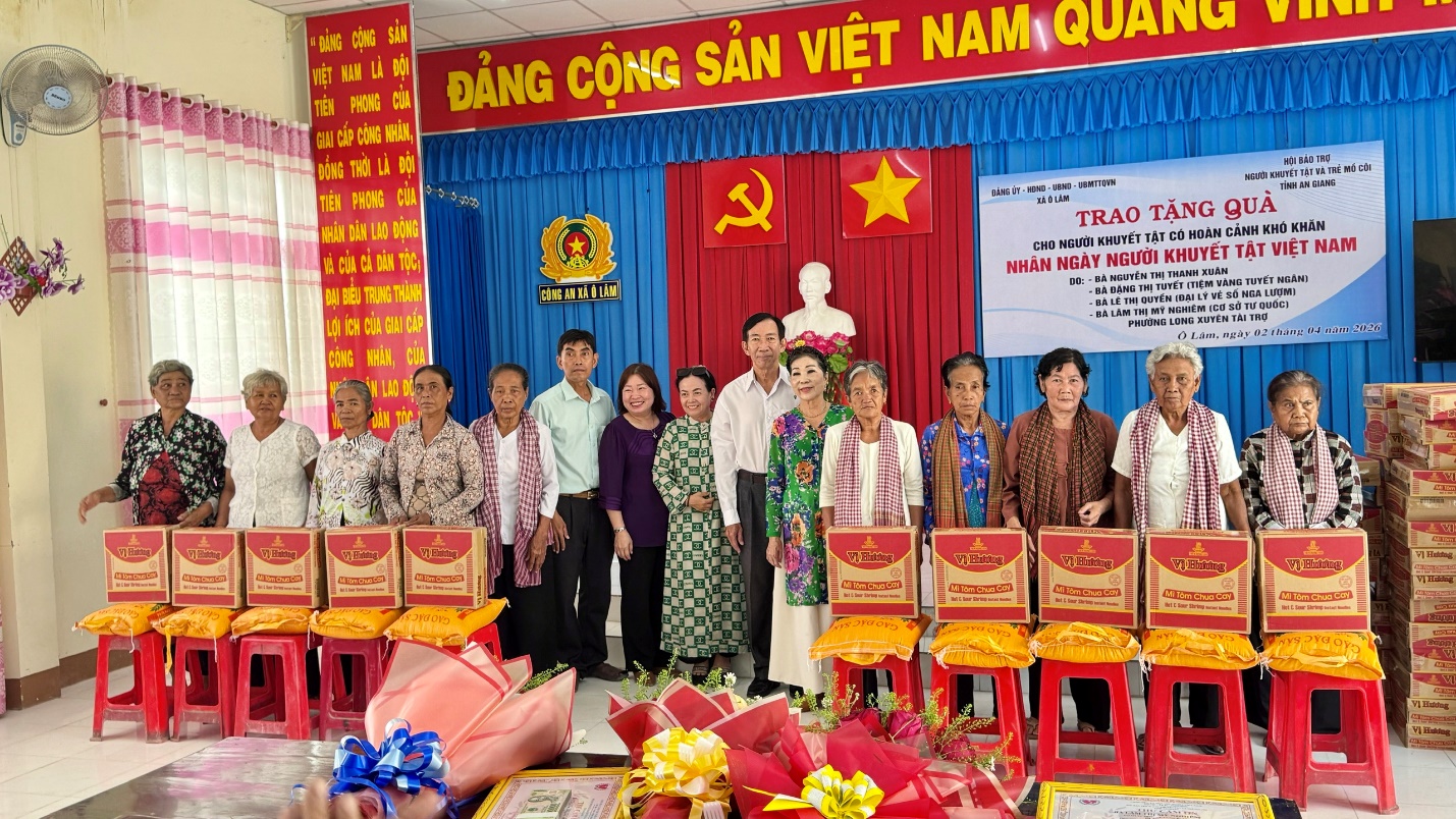 (Cổng TTĐT tỉnh AG)-Hướng đến kỷ niệm Ngày Người khuyết tật Việt Nam (18/4), sáng ngày 02/4/2026, Hội Bảo trợ người khuyết tật và trẻ mồ côi tỉnh An Giang phối hợp Đảng ủy, HĐND, UBND và Ủy ban MTTQ Việt Nam xã Ô Lâm tổ chức chương trình trao tặng quà cho người khuyết tật có hoàn cảnh khó khăn trên địa bàn xã.