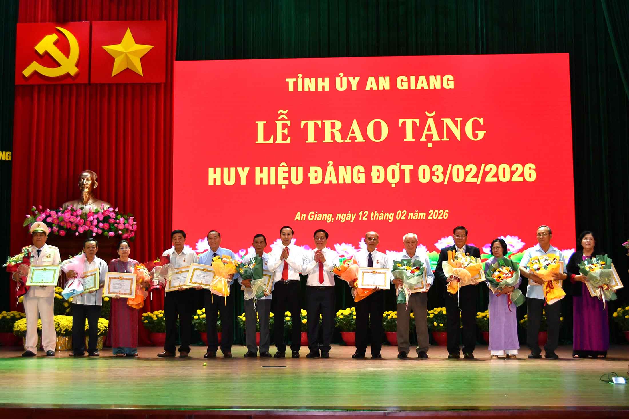 Tại buổi lễ, Ban Thường vụ Tỉnh ủy An Giang trao Huy hiệu Đảng đợt 3/2 cho 26 đồng chí cao niên; trong đó, có 3 đồng chí nhận Huy hiệu 60, 65 năm tuổi Đảng; 23 đồng chí nhận Huy hiệu 30, 40, 45, 50, 55 năm tuổi Đảng.