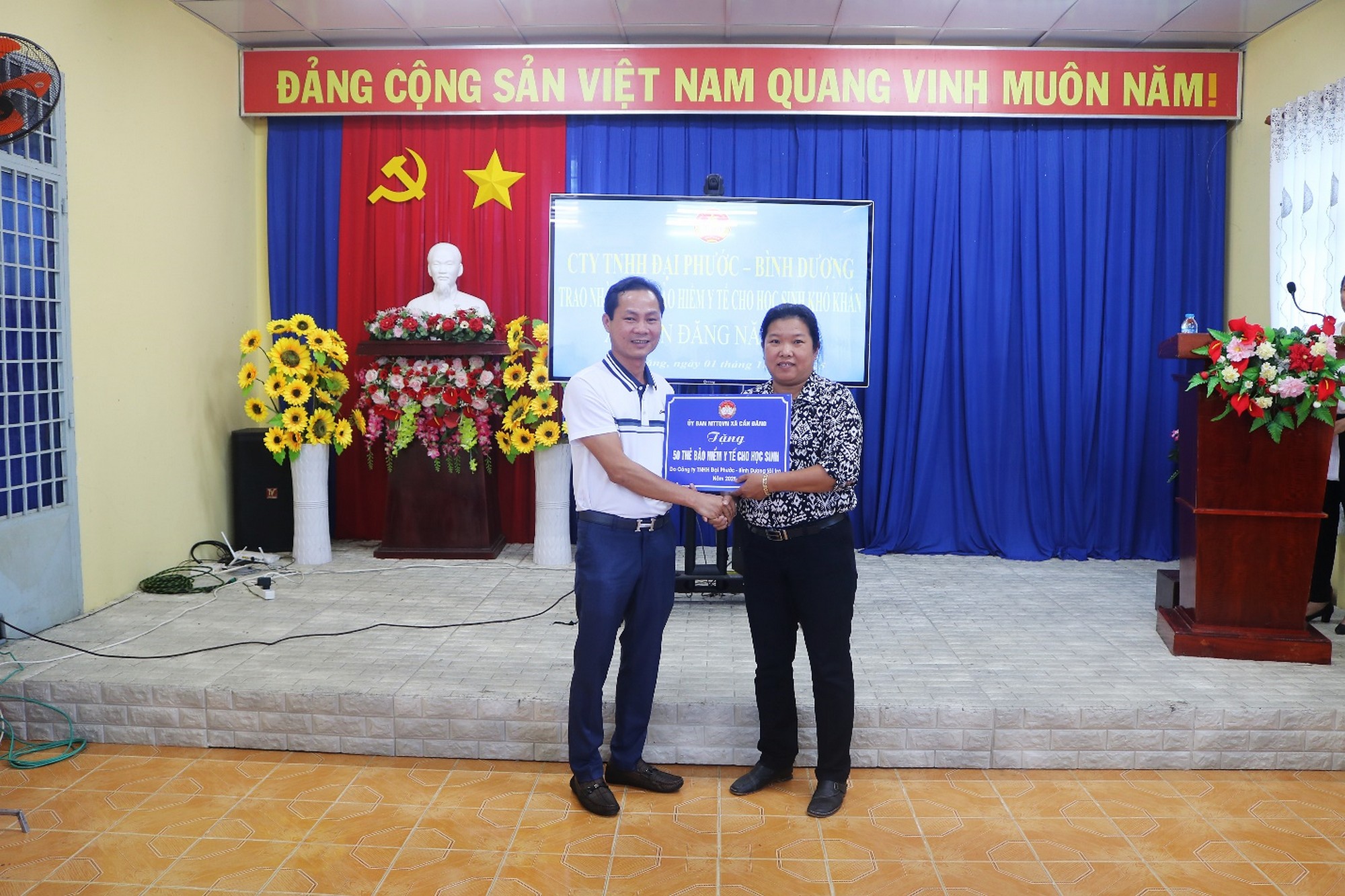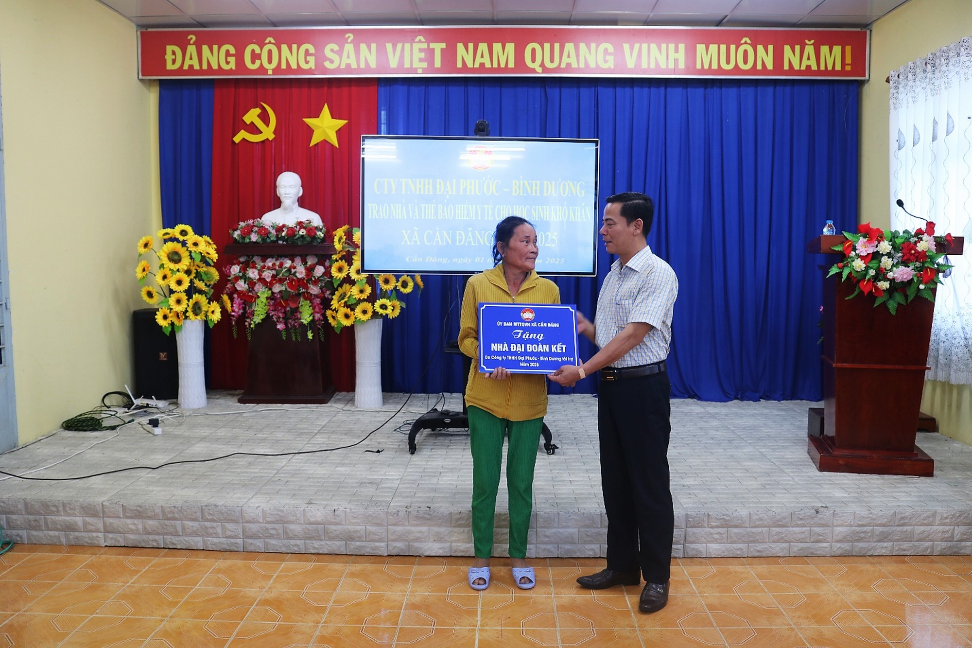 (Cổng TTĐT tỉnh AG)- Ngày 01/11, Ủy ban MTTQVN xã Cần Đăng phối hợp Công ty TNHH Đại Phước- Bình Dương tổ chức chương trình trao nhà đại đoàn kết và thẻ BHYT cho học sinh có hoàn cảnh khó khăn trên địa bàn xã. Tham dự lễ có Chủ tịch Ủy ban MTTQVN xã Cần Đăng Sun Thị Hạnh Dung; Phó Chủ tịch UBND xã Cần Đăng Nguyễn Thị Mai Thu.