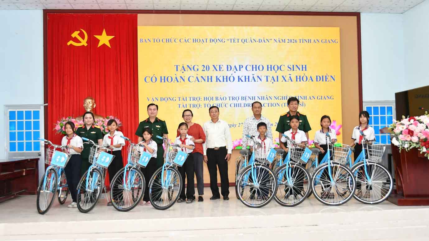 (Cổng TTĐT tỉnh AG)- Trong khuôn khổ các hoạt động Tết Quân – Dân năm 2026 tại xã Hòa Điền, ngày 27-1, Hội Bảo trợ Bệnh nhân nghèo tỉnh An Giang đã tổ chức trao tặng 20 chiếc xe đạp cho học sinh có hoàn cảnh khó khăn tại xã.