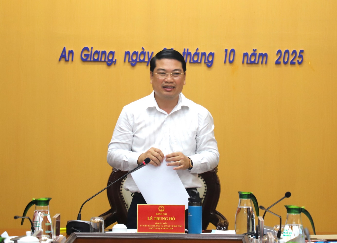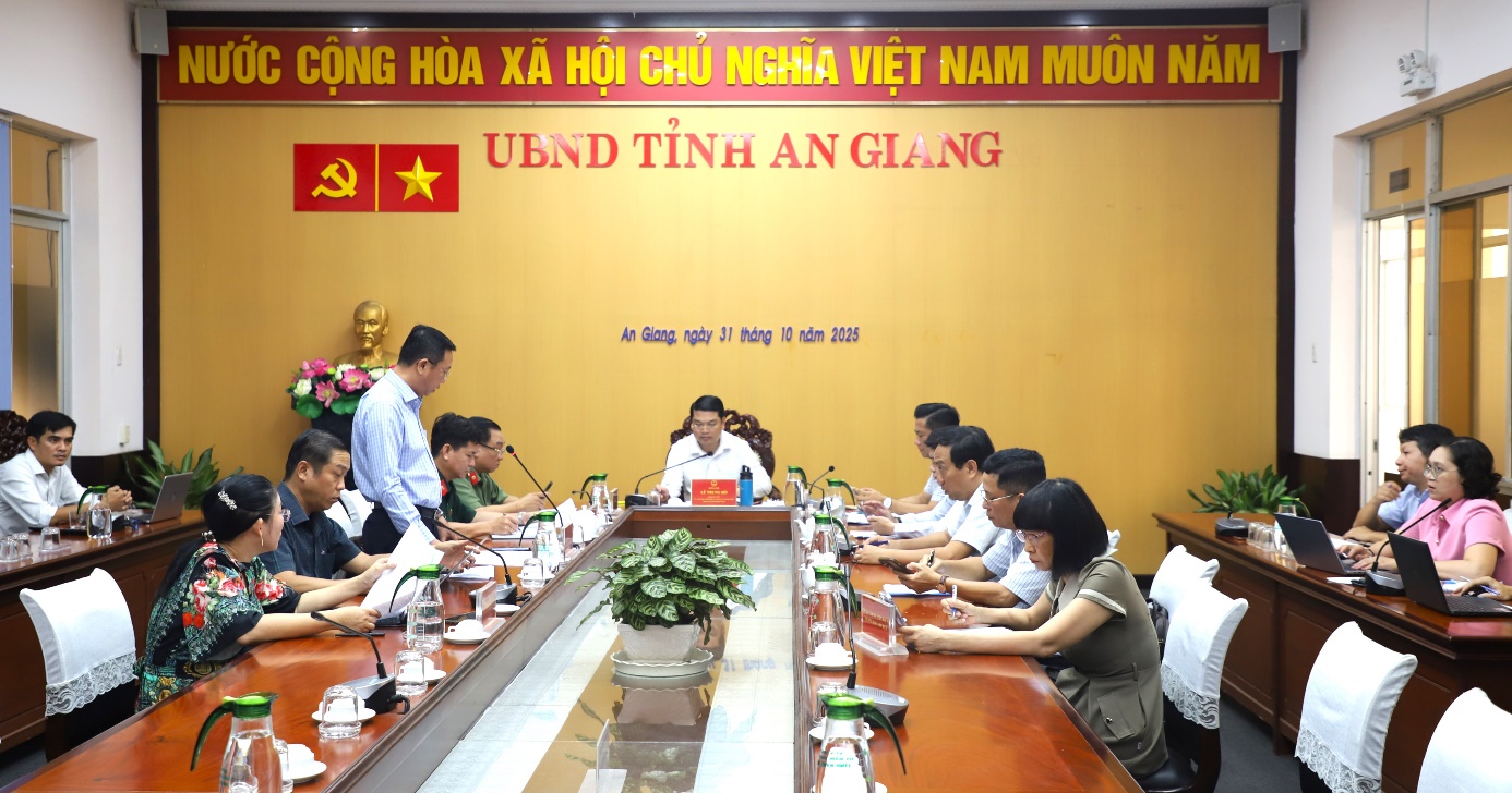 (Cổng TTĐT tỉnh AG)- Sáng ngày 31/10, Tỉnh ủy viên, Phó Chủ tịch UBND tỉnh An Giang Lê Trung Hồ tổ chức cuộc họp triển khai các nhiệm vụ của Tiểu ban Vật chất và Hậu cần thuộc Ban Chỉ đạo cấp tỉnh chuẩn bị, tổ chức hội nghị, hoạt động của Năm APEC 2027 tại đặc khu Phú Quốc, tỉnh An Giang; thành viên Ban Chỉ đạo Vật chất và Hậu cần theo Quyết định số 80/QĐ-BCĐ ngày 15/10/2025; trực tuyến với đặc khu Phú Quốc.