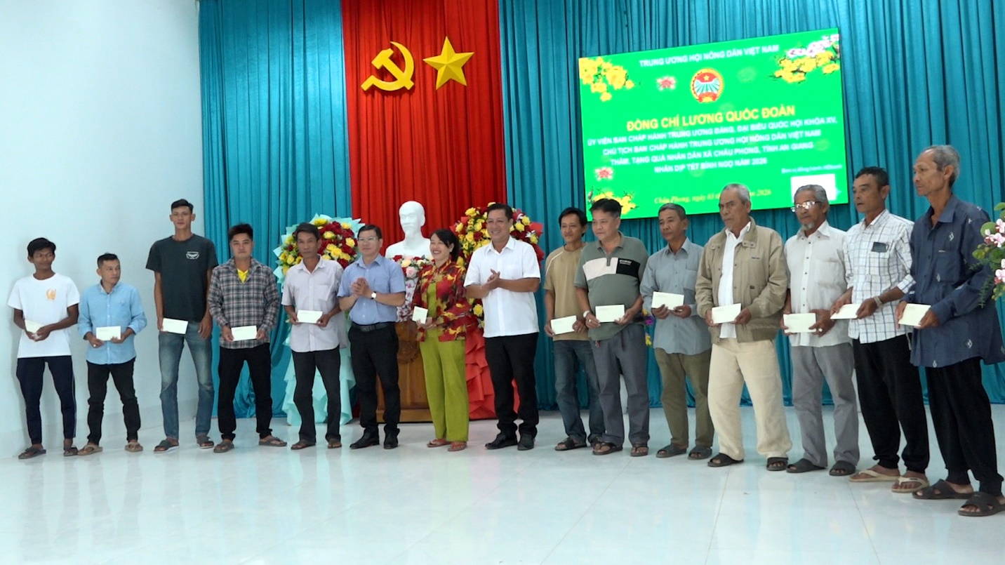 (Cổng TTĐT tỉnh AG)- Ngày 03/02, Trung ương Hội Nông dân Việt Nam phối hợp Đoàn đại biểu Quốc hội tỉnh An Giang tổ chức chương trình trao quà Tết cho hội viên nông dân có hoàn cảnh khó khăn nhân dịp Tết Nguyên đán Bính Ngọ 2026 tại xã Châu Phong.