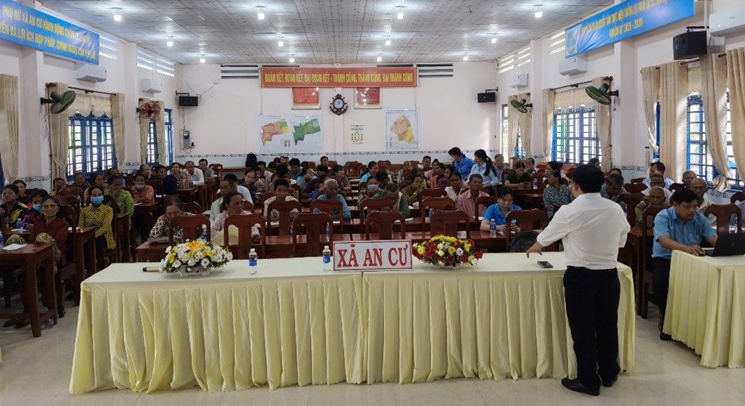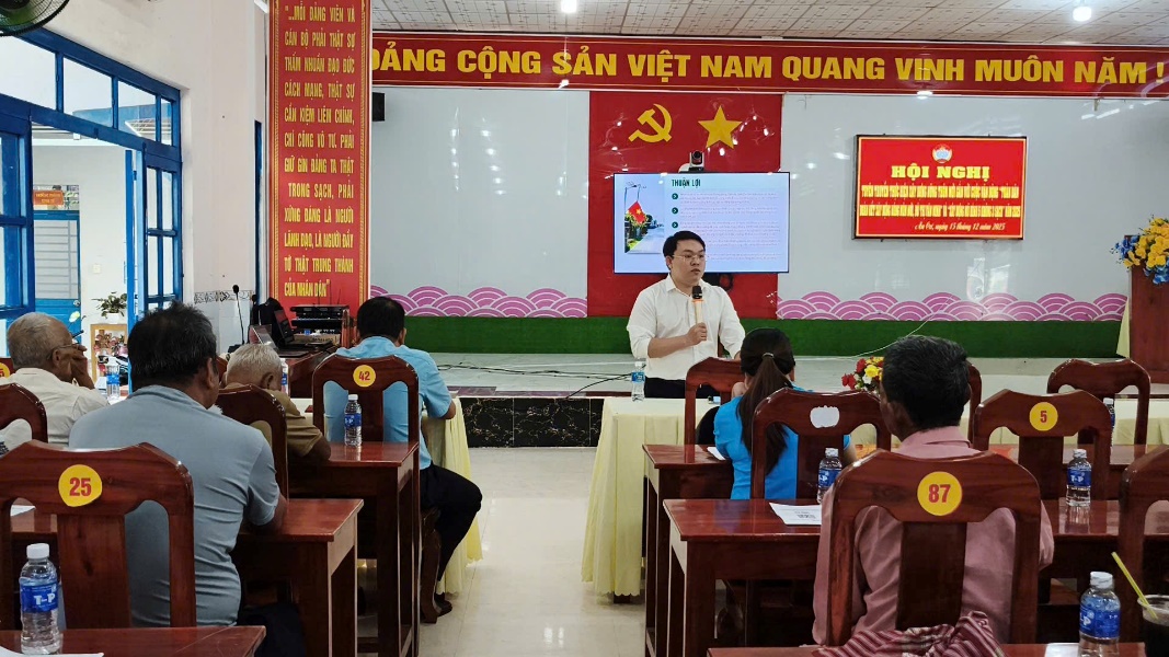 Tại đây, các đại biểu được nghe báo cáo viên của Ủy ban MTTQ Việt Nam tỉnh An Giang tuyên truyền các chủ trương, chính sách, định hướng, nội dung về xây dựng nông thôn mới, nông thôn mới nâng cao giai đoạn 2021-2025 trên địa bàn tỉnh An Giang. Phổ biến về công tác bảo vệ môi trường và nước sạch nông thôn trong xây dựng nông thôn mới, đảm bảo môi trường nông thôn sáng - xanh - sạch -đẹp, an toàn. Đồng thời, triển khai Chương trình chuyển đổi số trong xây dựng nông thôn mới hướng tới xây dựng nông thôn mới thông minh; Đẩy mạnh ứng dụng chuyển đổi số tại khu vực nông thôn; Kết nối cung cầu, tiêu thụ sản phẩm gắn với thương mại điện tử, góp phần thực hiện tiêu chí Tổ chức sản xuất trong xây dựng nông thôn mới và quảng bá hình ảnh, khẩu hiệu của Chương trình MTQG xây dựng nông thôn mới và Chương trình OCOP giai đoạn 2021 - 2025.