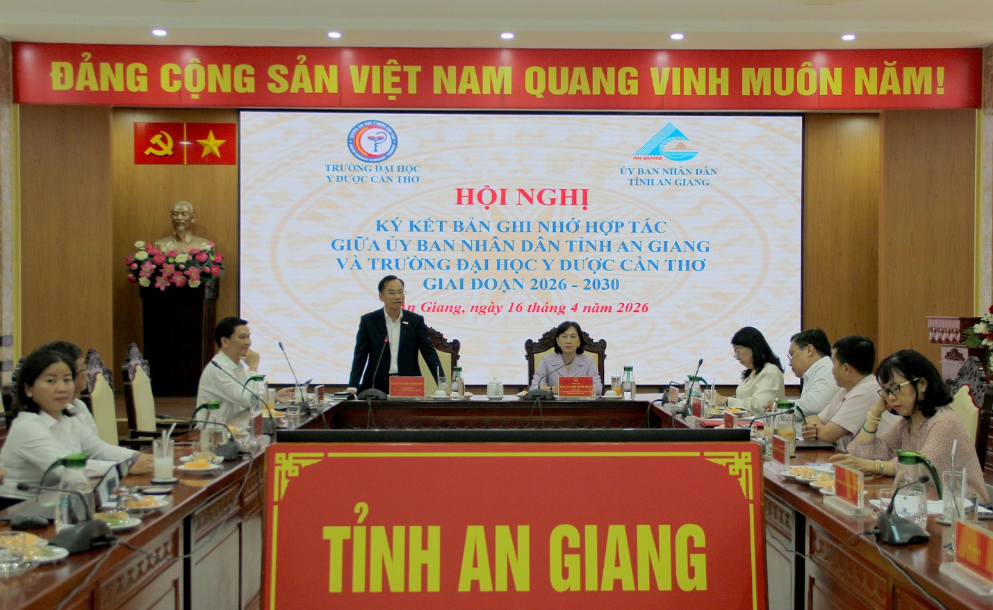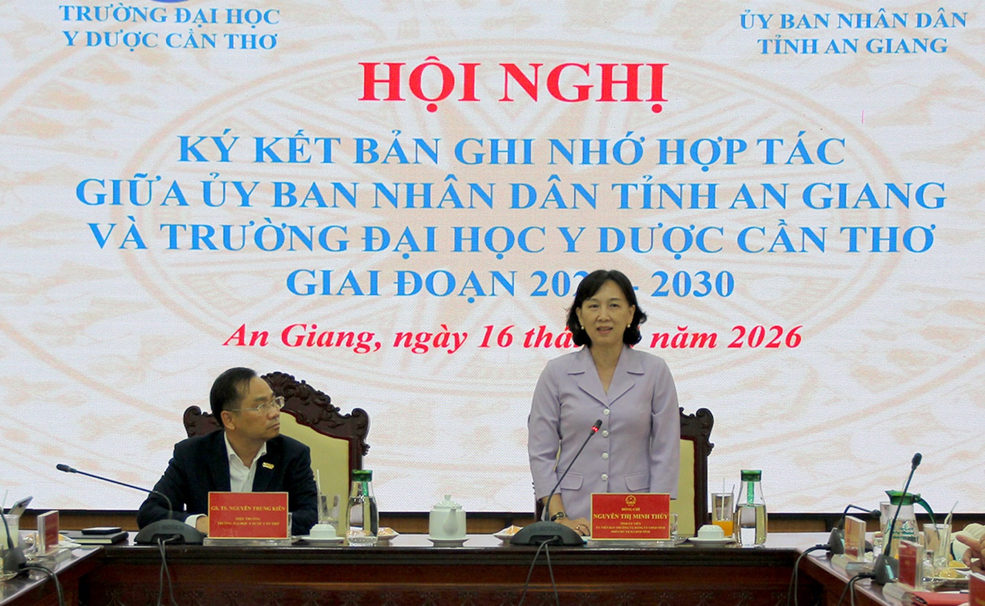 (Cổng TTĐT tỉnh AG)- Chiều 16/4, Phó Chủ tịch Ủy ban nhân dân tỉnh Nguyễn Thị Minh Thúy chủ trì Hội nghị ký kết Bản ghi nhớ hợp tác giai đoạn 2025-2030 giữa Ủy ban nhân dân tỉnh An Giang và Trường Đại học Y Dược Cần Thơ; Cùng tham dự và đồng chủ trì có GS. TS. Nguyễn Trung Kiên - Hiệu trưởng Trường Đại học Y Dược Cần Thơ.
