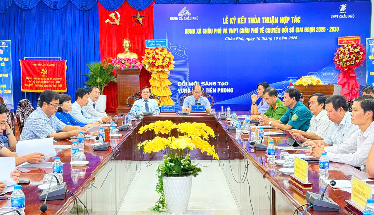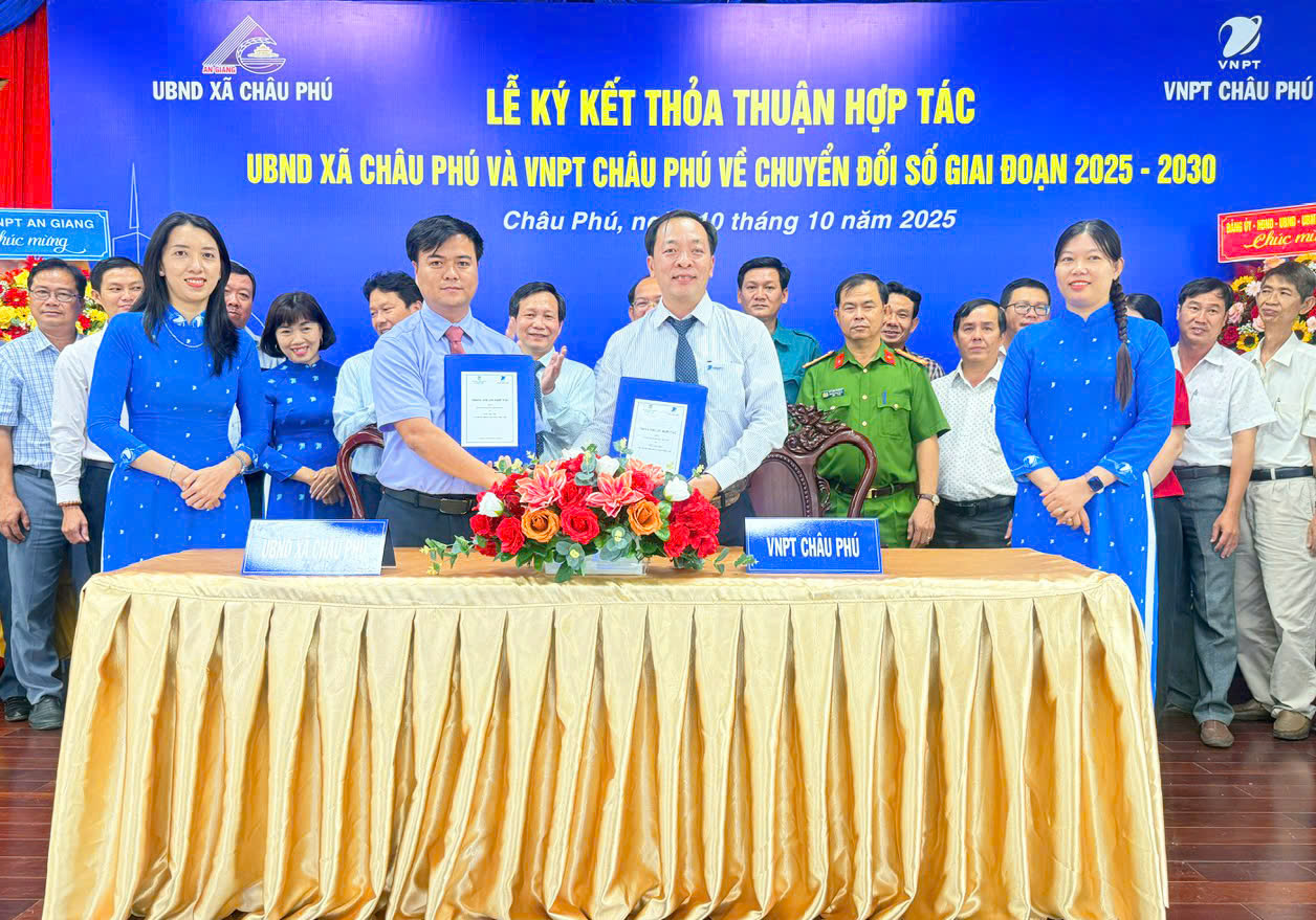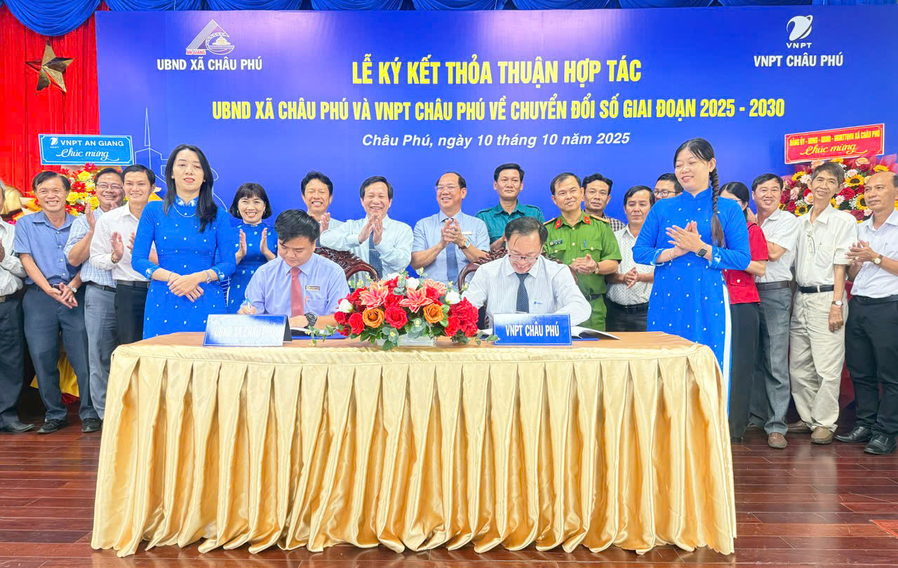 (Cổng TTĐT tỉnh AG)- Chiều 10/10, UBND xã Châu Phú (tỉnh An Giang) tổ chức Lễ ký kết thỏa thuận hợp tác chuyển đổi số giai đoạn 2025 – 2030 với VNPT Châu Phú.
