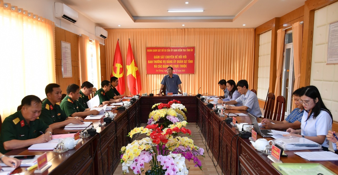 Tại buổi làm việc, Đoàn Giám sát đã tiến hành giám sát chuyên đề đối với Ban Thường vụ Đảng ủy Quân sự tỉnh và các đảng bộ trực thuộc về việc triển khai, quán triệt và tổ chức thực hiện Nghị quyết Đại hội đại biểu Đảng bộ tỉnh An Giang lần thứ I, nhiệm kỳ 2025–2030. Nội dung giám sát tập trung vào các vấn đề trọng tâm như: công tác lãnh đạo, chỉ đạo của Ban Thường vụ Đảng ủy Quân sự tỉnh trong việc tổ chức quán triệt, tuyên truyền Nghị quyết; việc xây dựng, ban hành chương trình hành động, kế hoạch và các văn bản cụ thể hóa Nghị quyết; kết quả thực hiện các nhiệm vụ trọng tâm, khâu đột phá và chỉ tiêu chủ yếu gắn với nhiệm vụ quốc phòng, quân sự địa phương.