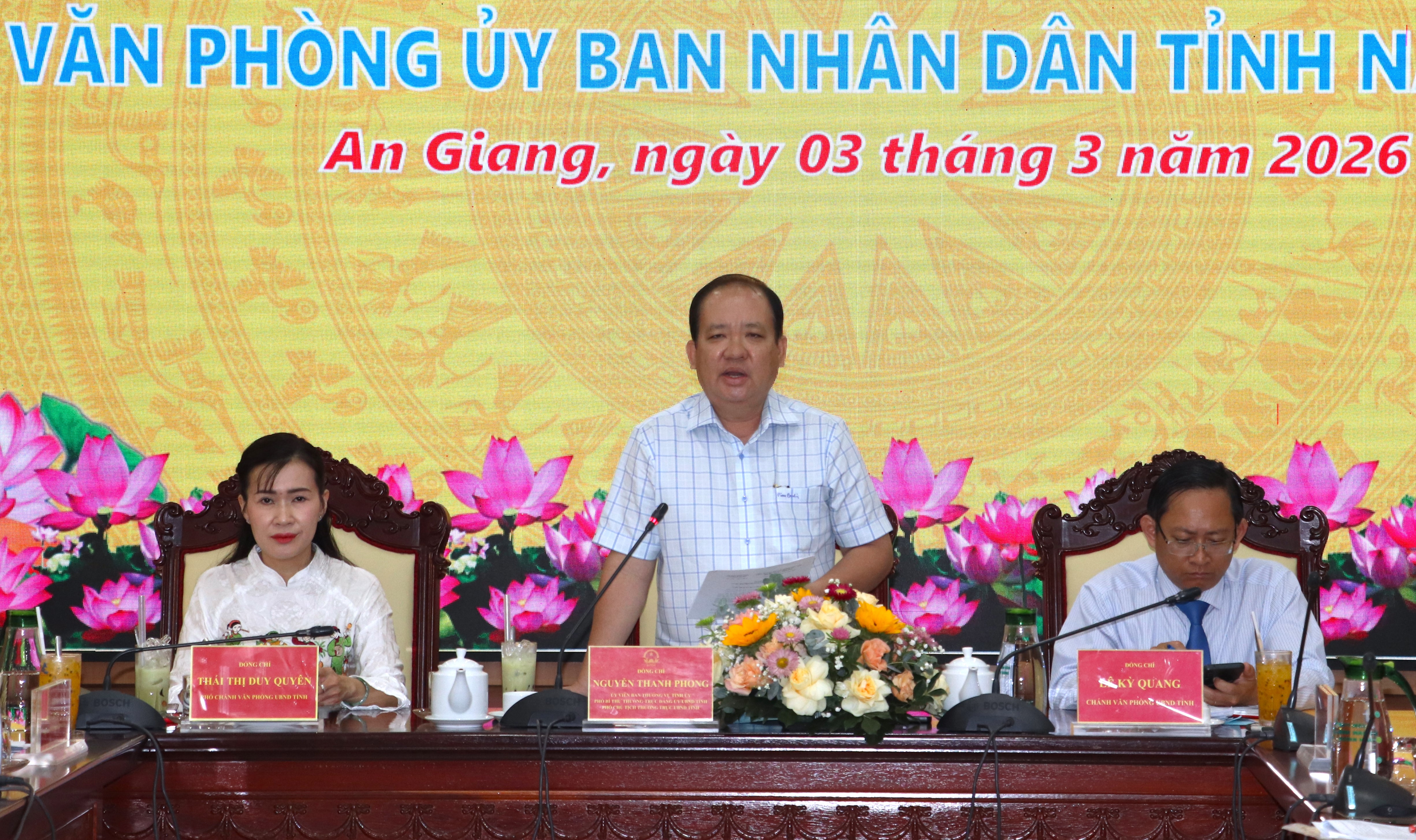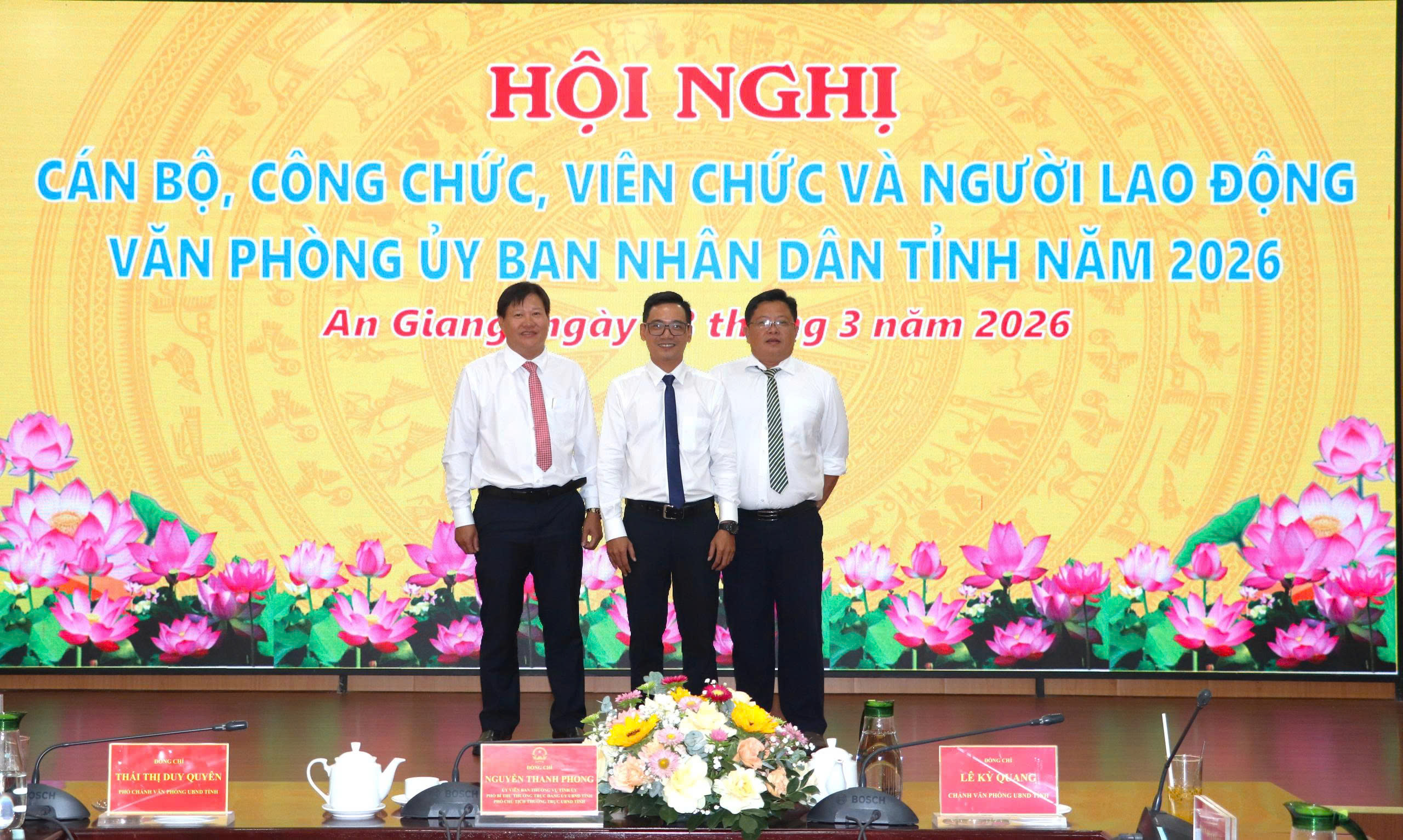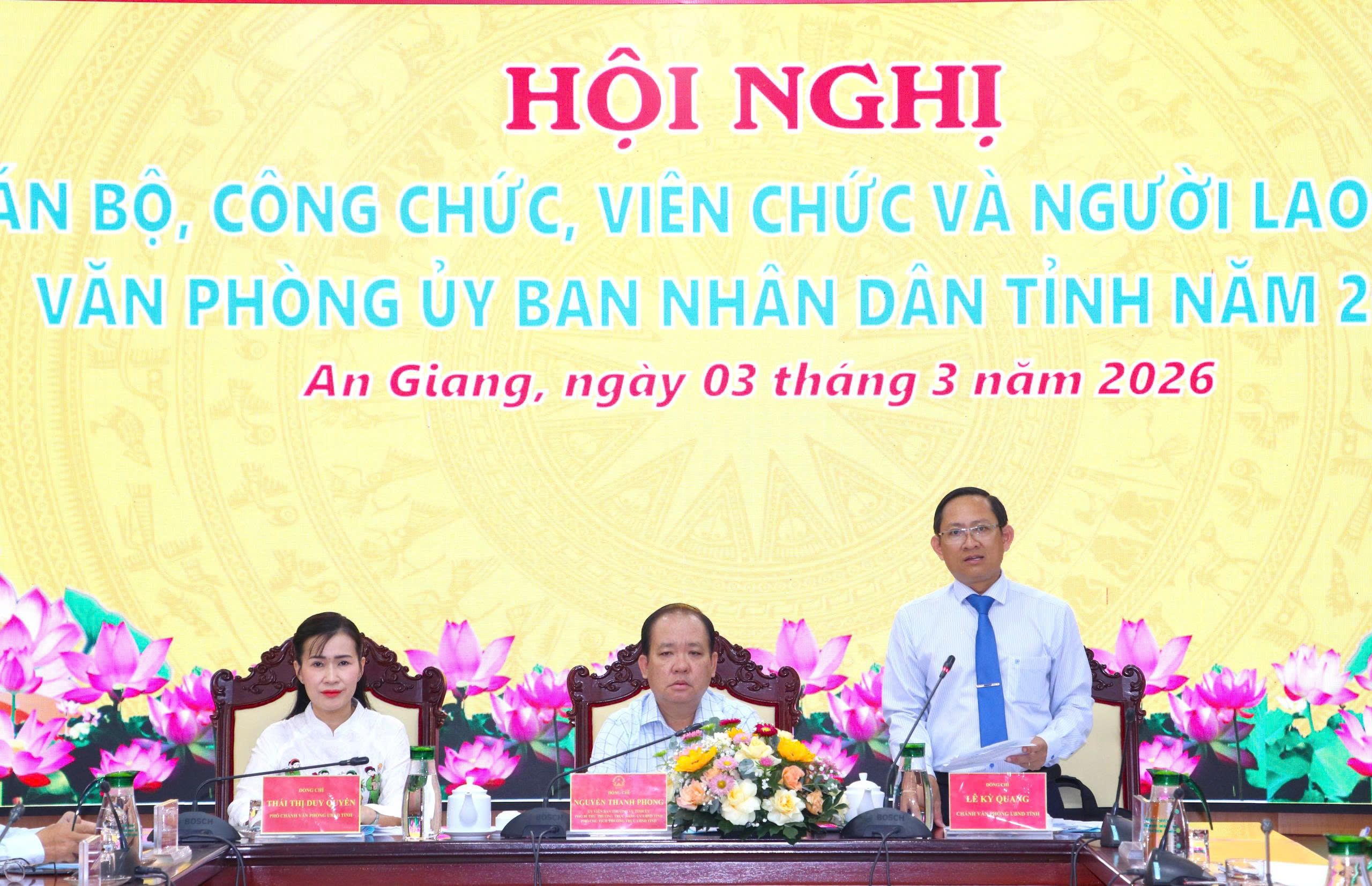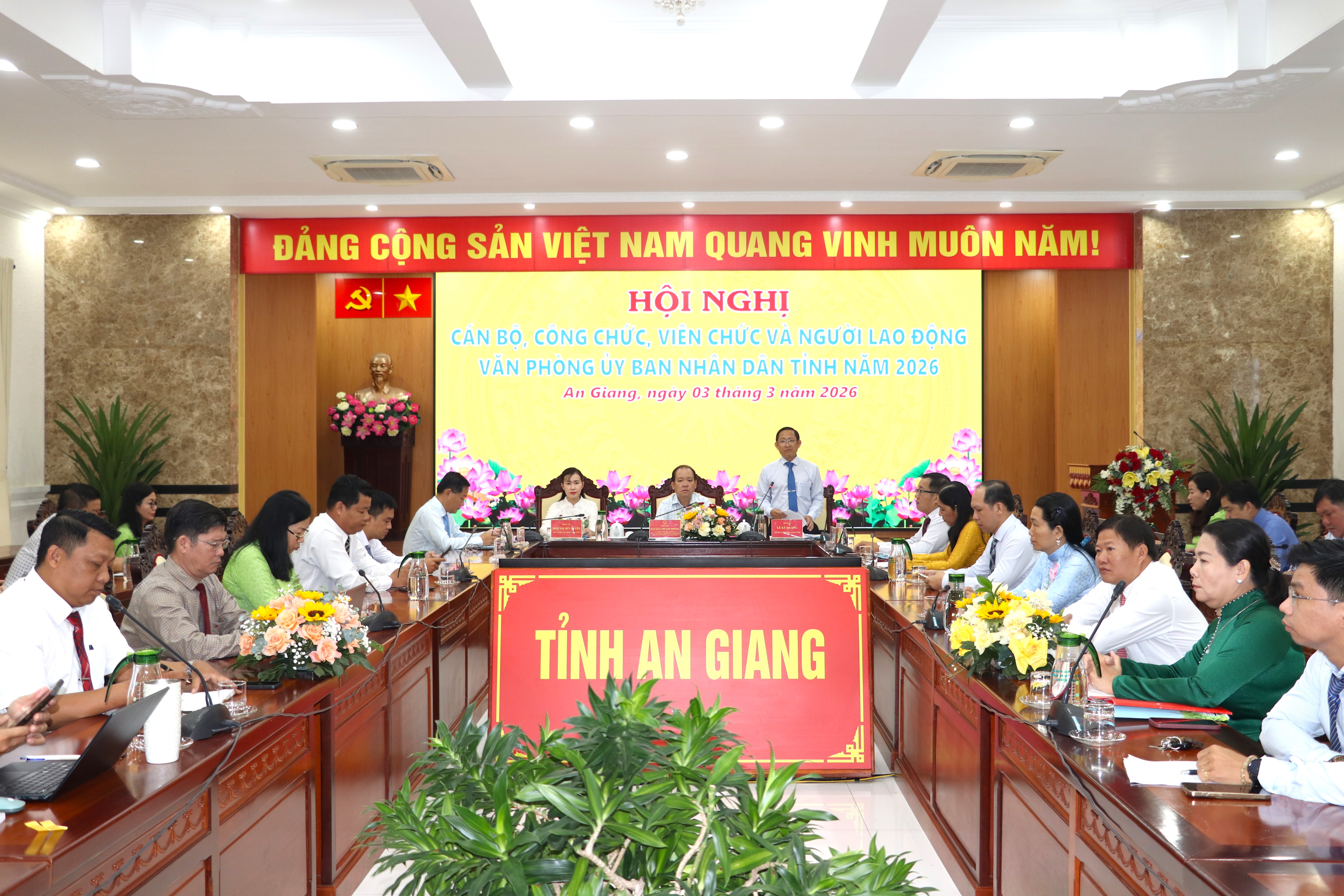 (Cổng TTĐT tỉnh AG) - Ngày 03/3, Văn phòng UBND tỉnh tổ chức Hội nghị cán bộ, công chức, viên chức, người lao động Văn phòng UBND tỉnh năm 2026. Hội nghị do Chánh Văn phòng UBND tỉnh Lê Kỳ Quang chủ trì. Ủy viên Ban Thường vụ Tỉnh ủy, Phó Chủ tịch Thường trực UBND tỉnh Nguyễn Thanh Phong dự và phát biểu chỉ đạo Hội nghị.