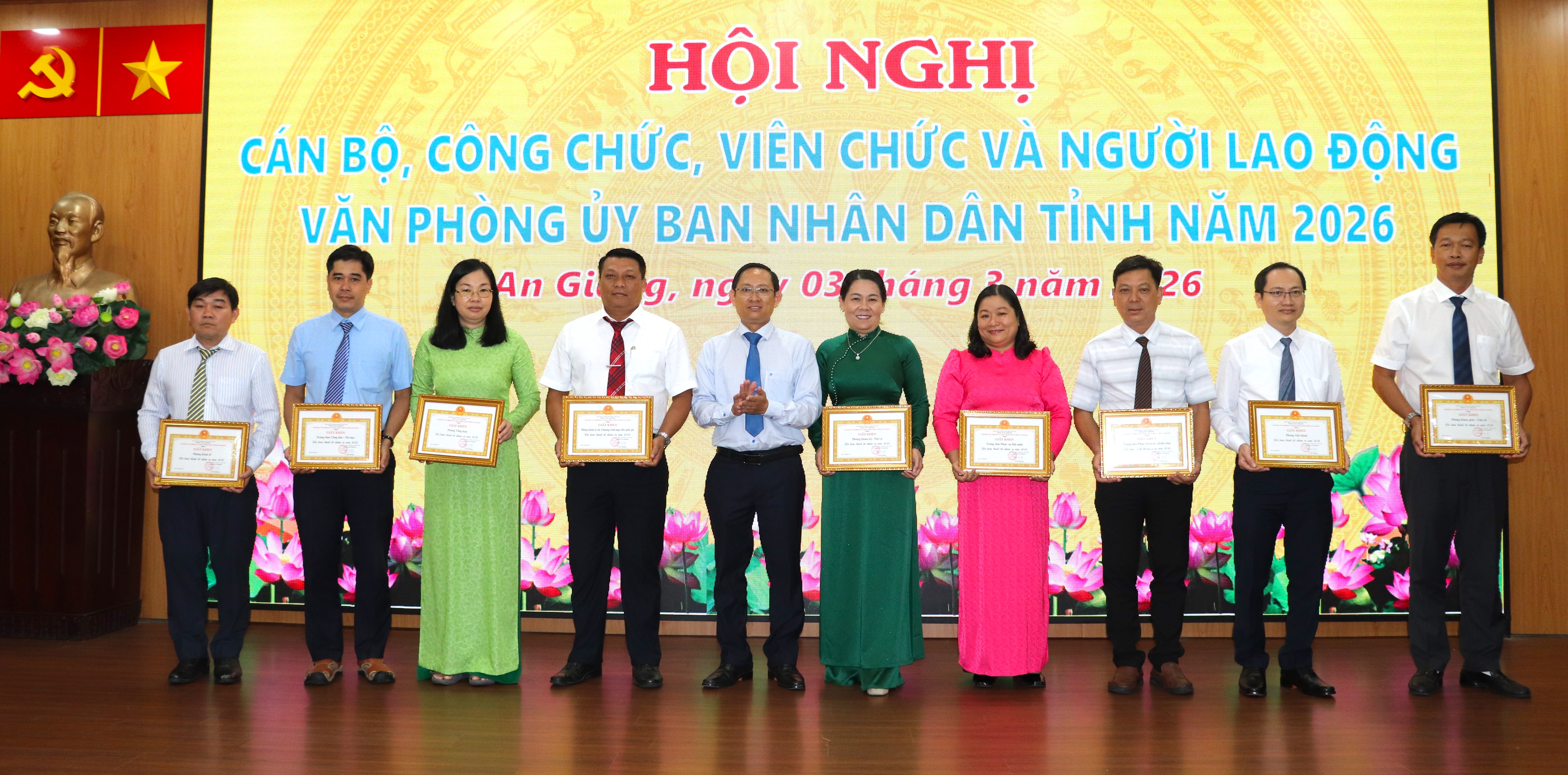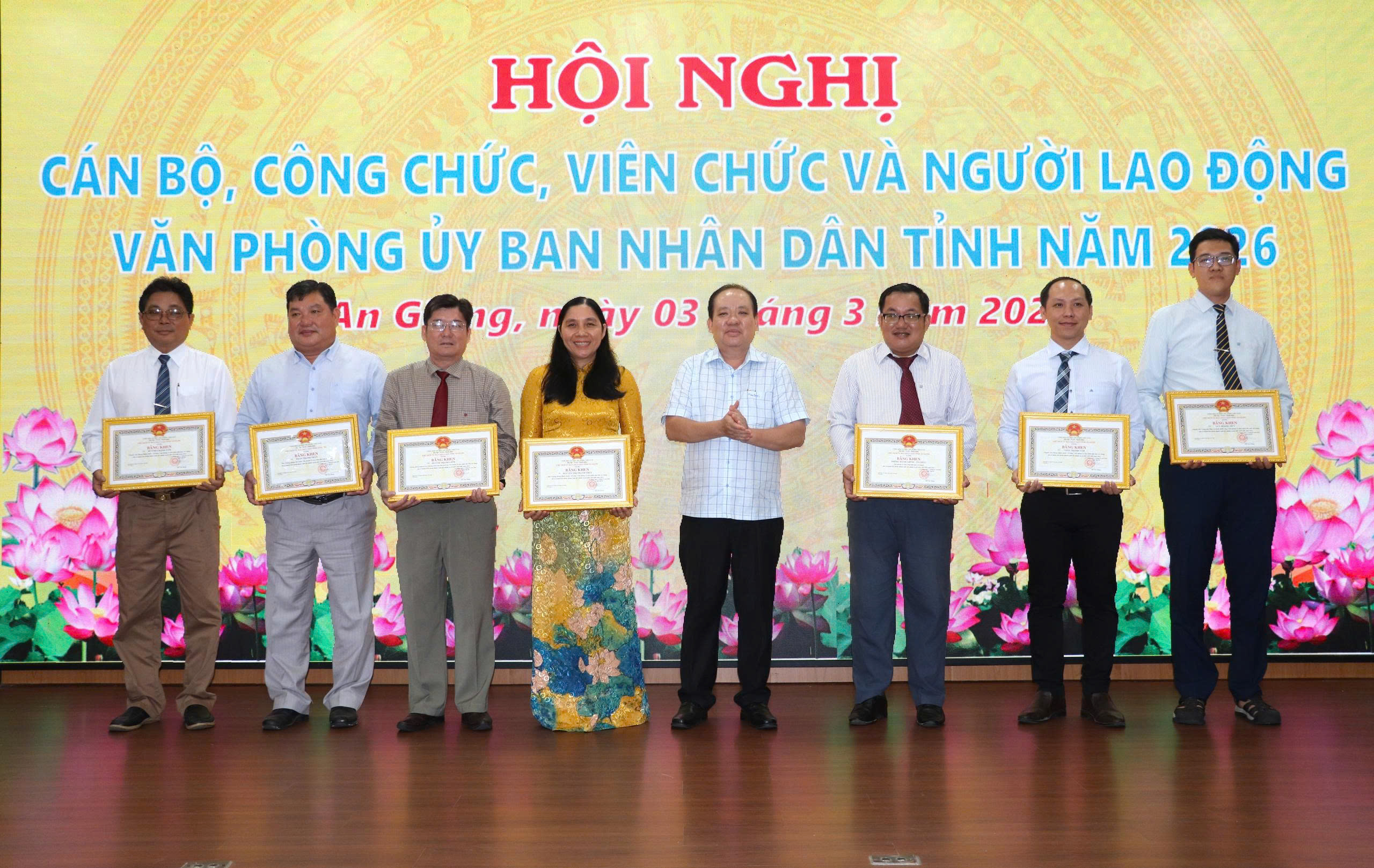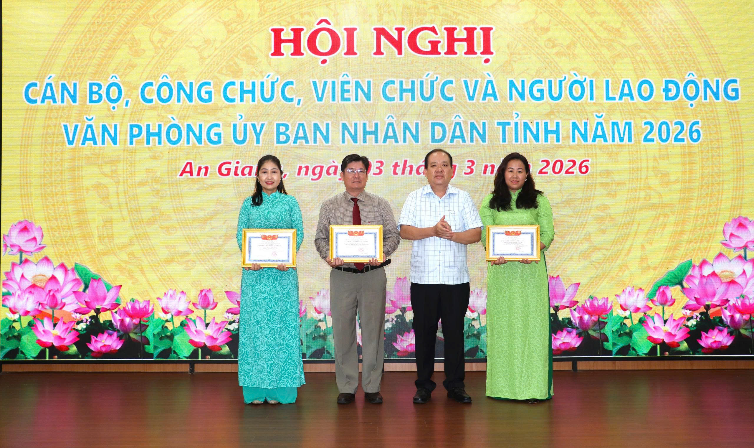 Dịp này, Chủ tịch UBND tỉnh tặng danh hiệu “Tập thể Lao động xuất sắc” cho 3 tập thể hoàn thành xuất sắc nhiệm vụ năm 2025; tặng bằng khen cho 1 tập thể và 7 cá nhân có thành tích hoàn thành xuất sắc nhiệm vụ giai đoạn 2024 - 2025. Chánh Văn phòng UBND tỉnh tặng giấy khen nhiều tập thể, cá nhân đạt danh hiệu lao động tiên tiến năm 2025.