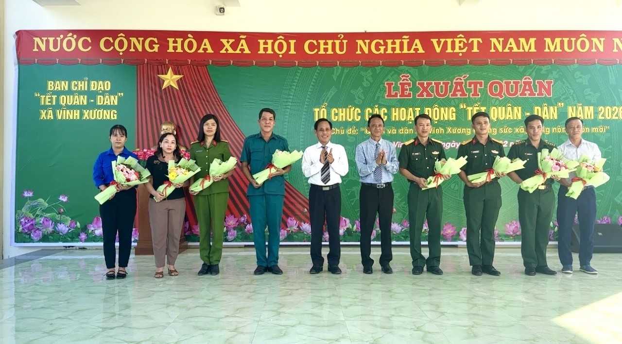 Phát biểu tại buổi lễ, Chủ tịch UBND xã, Trưởng Ban chỉ đạo Tết Quân – Dân xã Vĩnh Xương Bùi Thái Hoàng nhấn mạnh: Các hoạt động Tết Quân – Dân năm 2026 là hoạt động dân vận mang tính tổng hợp, với nhiều nội dung thiết thực hướng đến an sinh xã hội, hậu phương quân đội, đền ơn đáp nghĩa, và tham gia xây dựng kết cấu hạ tầng nông thôn. Qua đó góp phần nâng cao đời sống vật chất, tinh thần cho nhân dân; tạo chuyển biến tích cực trong phát triển kinh tế, văn hóa, xã hội; Đồng thời thể hiện sự quan tâm sâu sắc của cấp ủy Đảng, chính quyền, Mặt trận Tổ quốc, các ban ngành, đoàn thể, lực lượng vũ trang cùng các tổ chức doanh nghiệp, mạnh thường quân. Đây không chỉ là trách nhiệm mà còn là vinh dự của cán bộ, chiến sĩ trong phong trào thi đua “Quân và dân xã Vĩnh Xương chung sức xây dựng nông thôn mới”. Đề nghị các lực lượng nêu cao tinh thần trách nhiệm, tích cực tham gia các hoạt động Tết Quân - Dân bảo đảm chất lượng, hiệu quả, vui tươi, lành mạnh, an toàn và tiết kiệm.