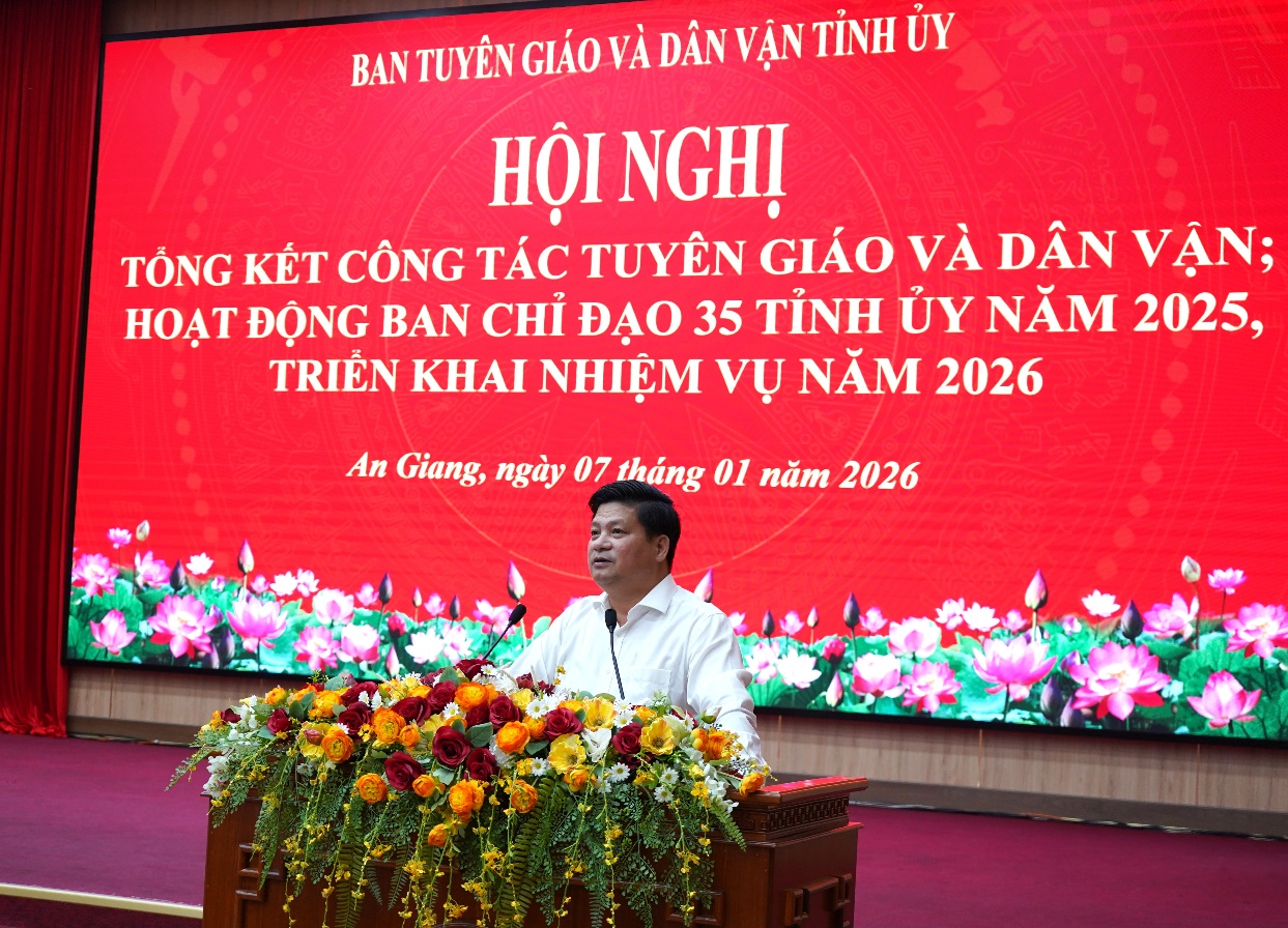 Phát biểu tiếp thu ý kiến chỉ đạo và kết luận tại Hội nghị tổng kết công tác tuyên giáo và dân vận năm 2025 và triển khai phương hướng, nhiệm vụ năm 2026 của Tỉnh ủy An Giang, đồng chí Tống Phước Trường, Ủy viên Ban Thường vụ, Trưởng Ban Tuyên giáo và Dân vận Tỉnh ủy đã nhấn mạnh, cần tiếp tục củng cố, kiện toàn tổ chức bộ máy, cán bộ tuyên giáo và dân vận các cấp theo hướng tinh gọn, hoạt động hiệu quả. Tăng cường công tác đào tạo, bồi dưỡng, nâng cao phẩm chất, bản lĩnh chính trị, năng lực chuyên môn, nghiệp vụ của đội ngũ cán bộ làm công tác tuyên giáo và dân vận đáp ứng tốt yêu cầu nhiệm vụ được giao. Thực hiện ứng dụng mạnh mẽ chuyển đổi số trong ngành tuyên giáo và dân vận.